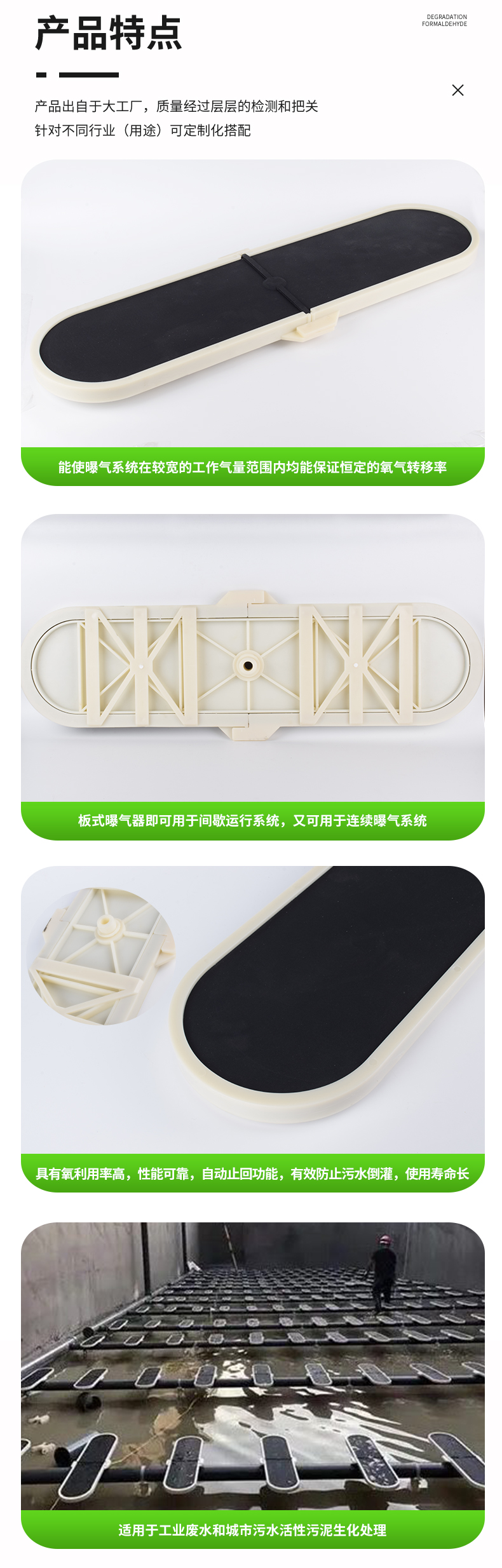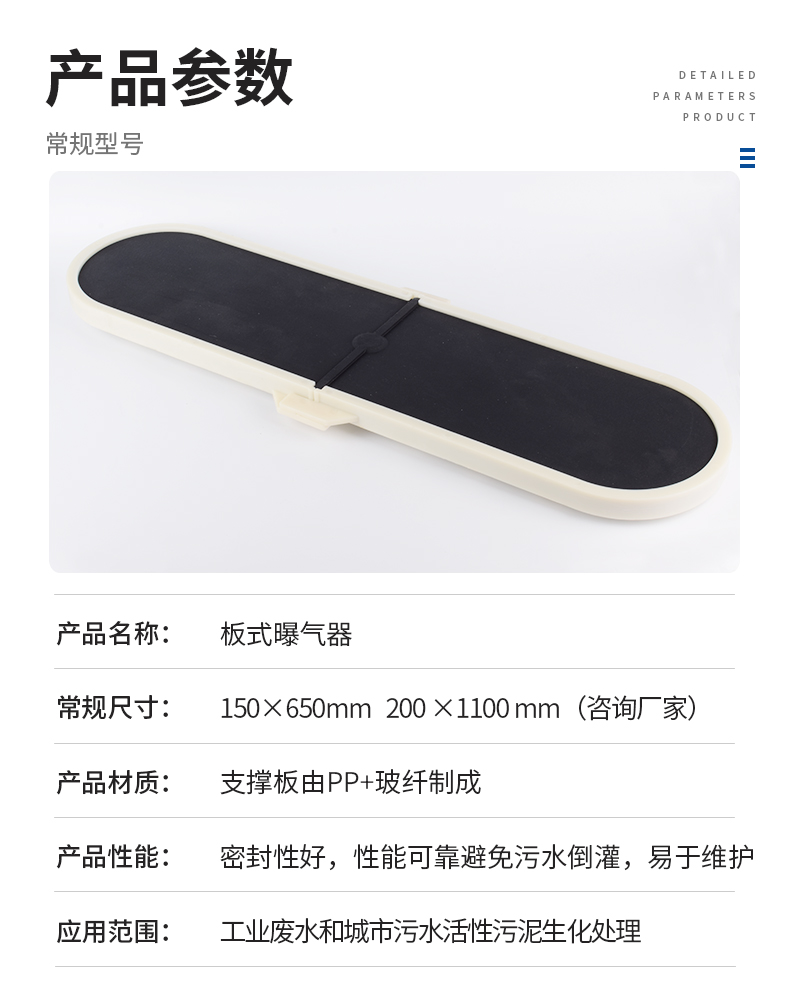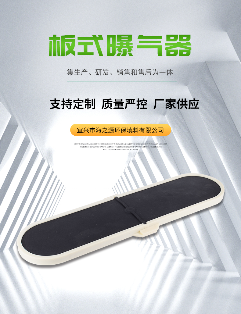 板式曝氣器設計結構使曝氣器系統在較寬的工作氣量范圍內保持低能耗、高效率;開孔方式,在鼓風機工作的過程中,曝氣器產生的氣泡均勻,達到很好的蓮花效應;該曝氣即可用于間歇運行系統,又可用于連續曝氣系統,具有氧利用率高,性能可靠,曝氣器具有自動止回功能,有效防止污水倒灌,使用壽命長等特點。