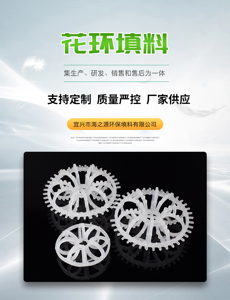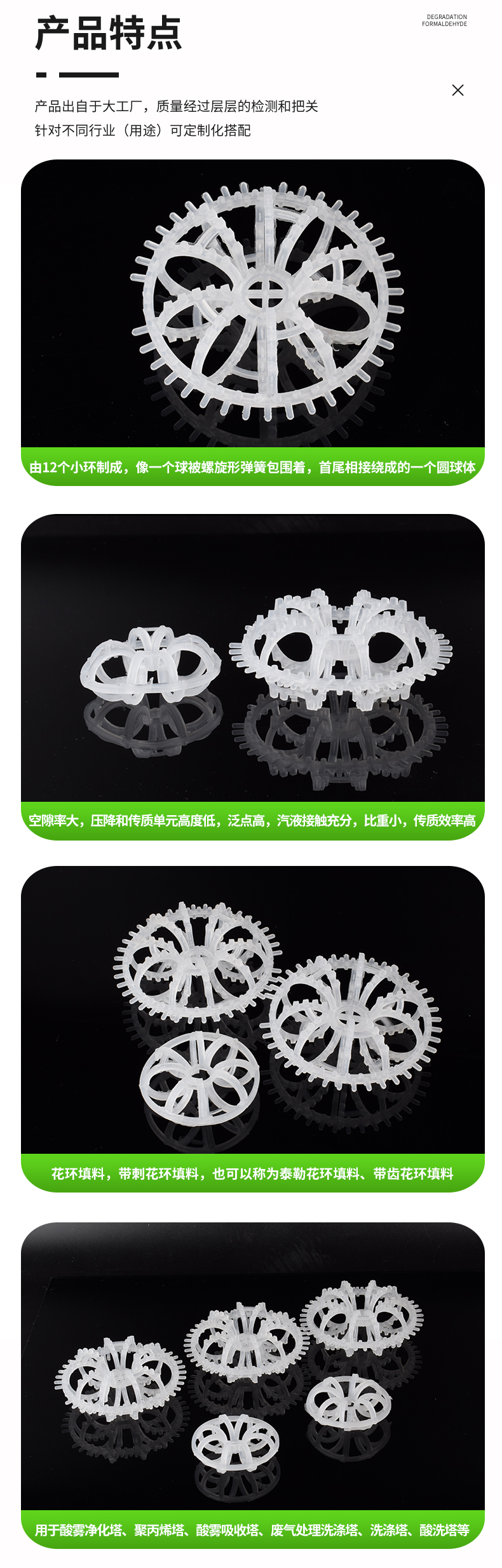 花環(huán)填料也稱梅花環(huán)填料是由許多圓環(huán)結繞而成,由于這種填料的間隙處能有較高的滯液量,可使塔內液體停留時間較長,從而增加了氣液的接觸時間,提高了填料的傳質效率。具有空隙率大,壓降和傳質單元高度低,泛點高,汽液接觸充分,比重小,傳質效率高等特點,多用于氣體洗滌、凈化塔中。