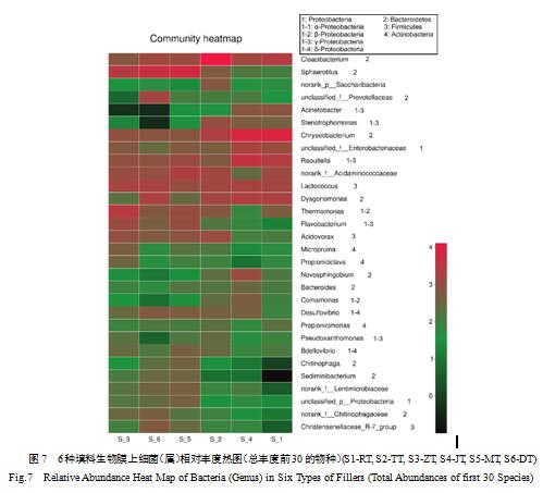 為進一步揭示其群落結構差異,基于細菌菌門水平(圖6)、變形菌門(表3)及菌屬水平(圖7)分析生物膜上的微生物群落結構組成。由圖6可知,從菌門水平來看,不同填料反應器中微生物群落組成的差異不是特別大。6種填料生物膜樣本的主要菌群均為變形菌門(Proteobacteria)、擬桿菌門(Bacteroidetes)、厚壁菌門(Firmicutes)及放線菌門(Actinobacteria)。以MT反應器為例,其生物膜樣本變形菌門占比達56.2%,其次是擬桿菌門(25.3%)、厚壁菌門(14.8%)。其他5種填料生物膜樣本上的變形菌門占比介于28%~54.3%,擬桿菌門占比介于23.5%~57.3%,厚壁菌門介于9.2%~16.1%。該結果與前人研究結果相近,如Ma等[21]在序批式反應器中發現的細菌群落組成中變形菌門(占比最大)、擬桿菌門及放線菌門占優勢;Snaidr等[22]在常規活性污泥中對菌群多樣性的研究中發現變形菌門(Proteobacteria)為優勢類群。在6個樣品中還有綠彎菌門(Chloroflexi)、浮酶菌門(Planctomycetes)、綠菌門(Chlorobi)及單胞菌門(Gemmatimonadetes)等,但所占比例均不同。其中綠菌門在顆;^程中有重要作用,能夠增強污泥的沉降性能。